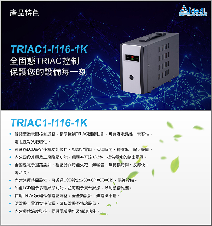 【愛迪歐IDEAL】1KVA 全固態TRIAC穩壓器 TRIAC1-I116-1K(800W)-訂製品